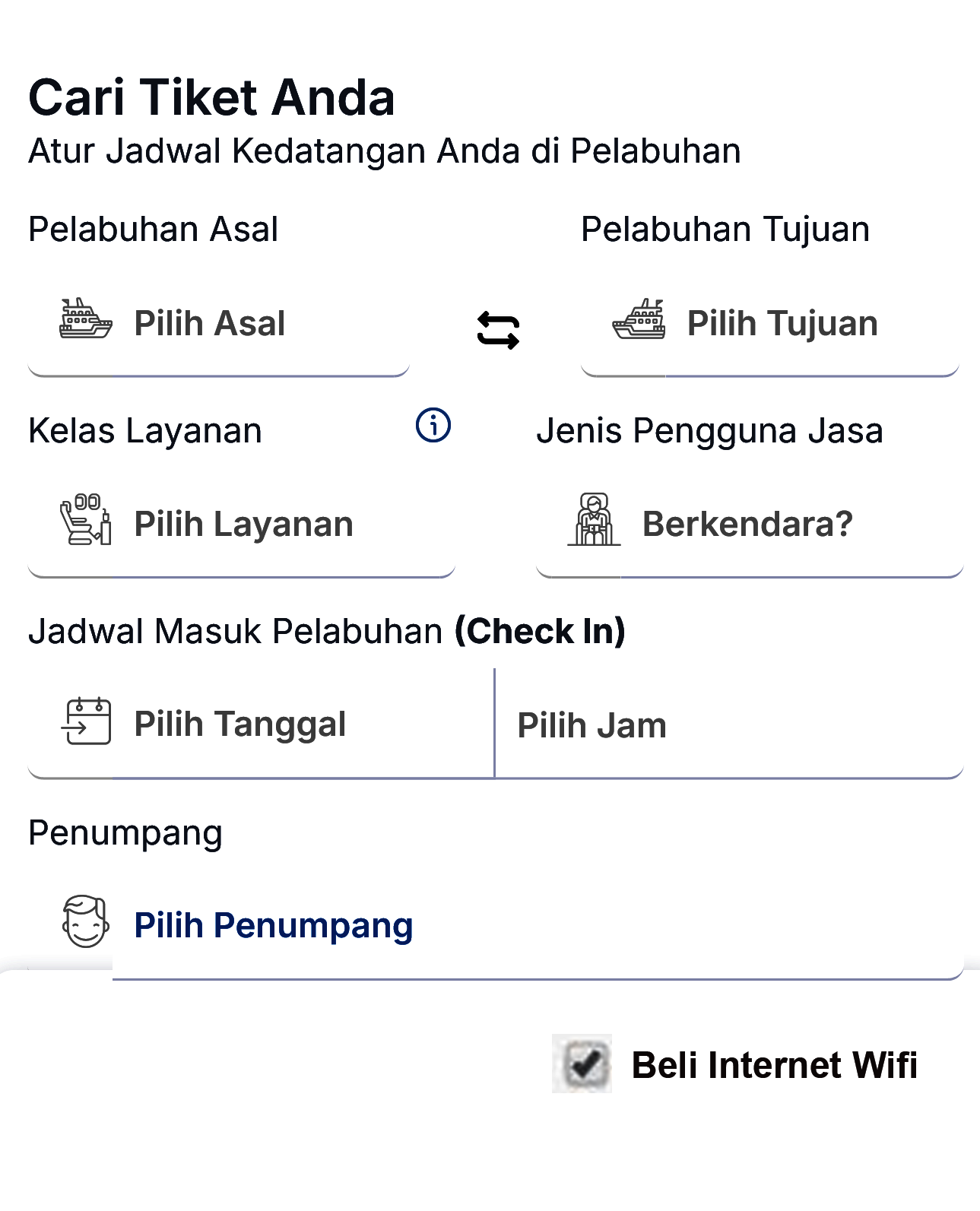 Kini anda dapat mengakses internet tanpa takut gangguan sinyal. Cukup hubungkan smarpohone anda ke wifi yang kami sediakan dan paket internetnya tersedia pada pembelian tiket kapal laut melalui aplikasi ticketing.